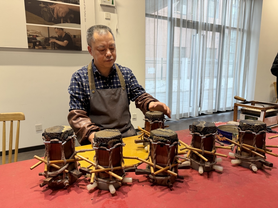 梅村二胡产业园内师傅展示二胡制作技艺 黄于悦摄