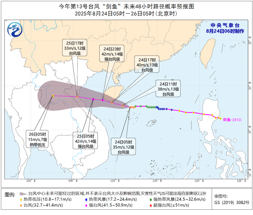 大风预报:8月24日8时至25日8时,南海大部、西沙群岛和中沙群岛附近海域、北部湾、琼州海峡、海南岛及沿海、广西沿海、广东中西部沿海将有6-8级大风,其中南海西北部和中西部及西沙群岛部分海域、北部湾中部和南海海域、海南岛沿海的风力有9-11级,“剑鱼”中心经过的附近海域或地区的风力可达12-14级、阵风15-16级。