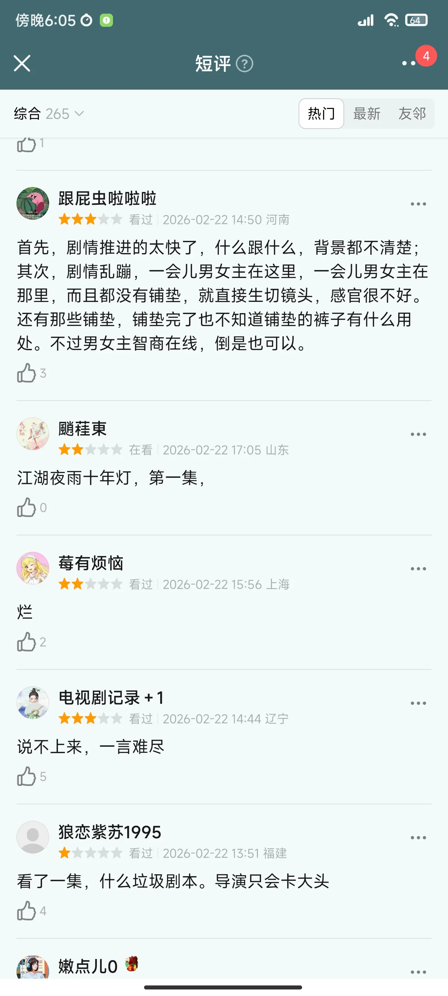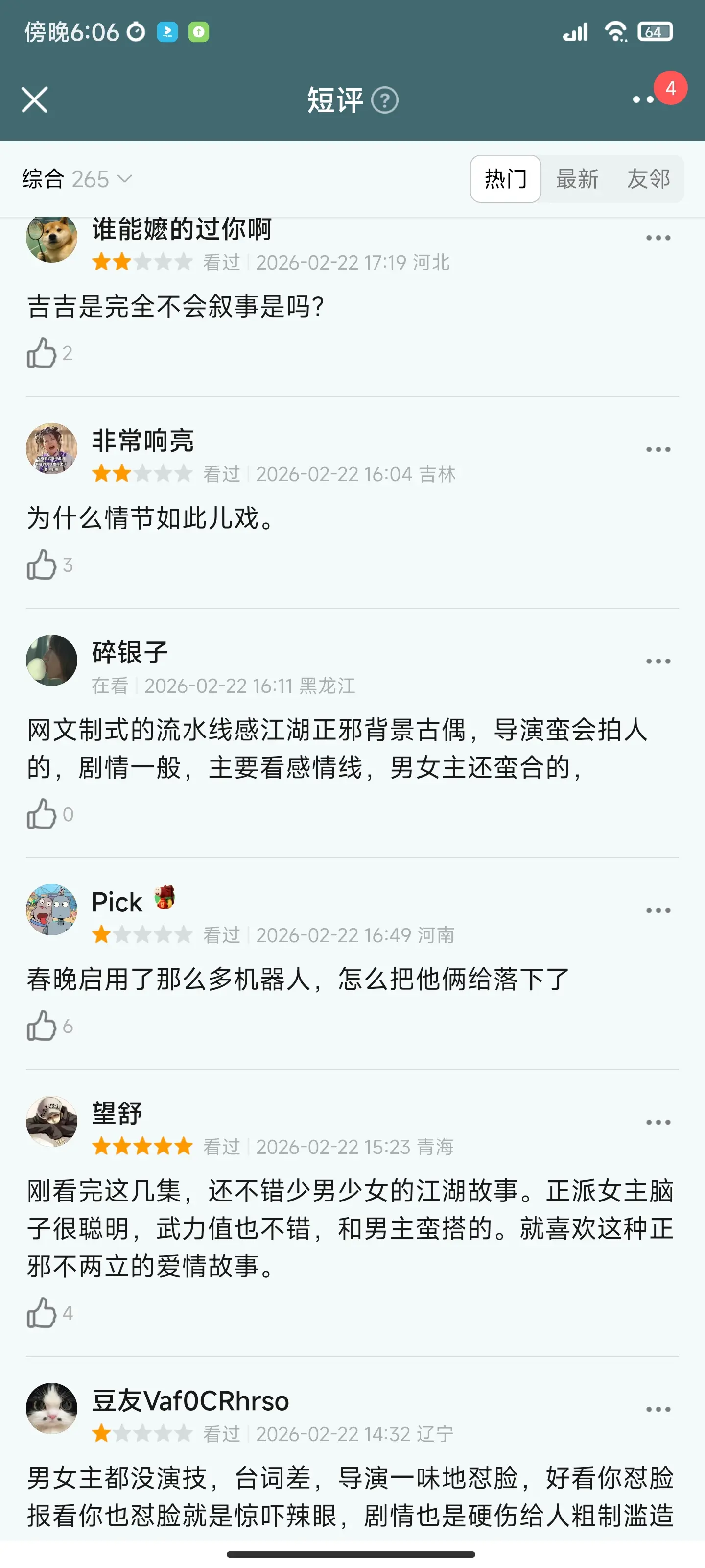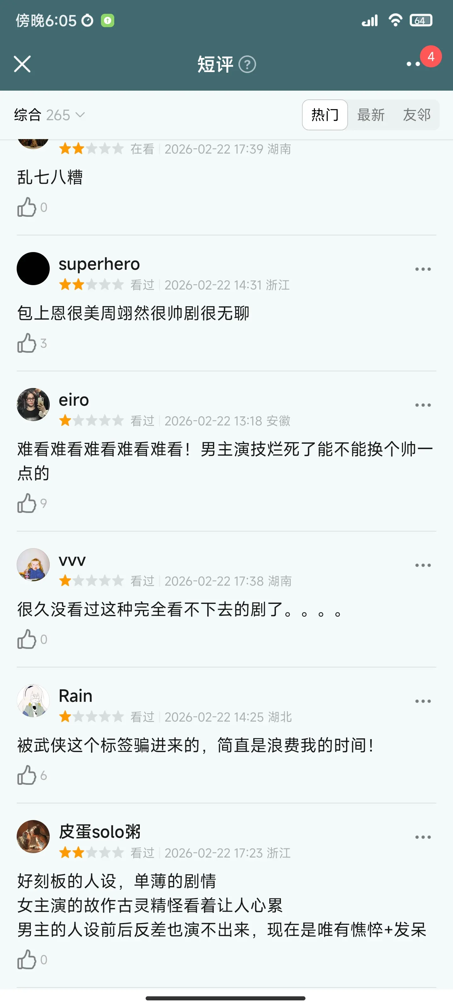 人物角色脸谱化,动不动就切慢镜头怼脸。女演员妆容特别现代,好几个角色都是苍蝇腿睫毛,头发比剑法还飘逸。包上恩长相可爱,建议闭关练练演技。还有男主一直切大头,感觉张不开嘴。