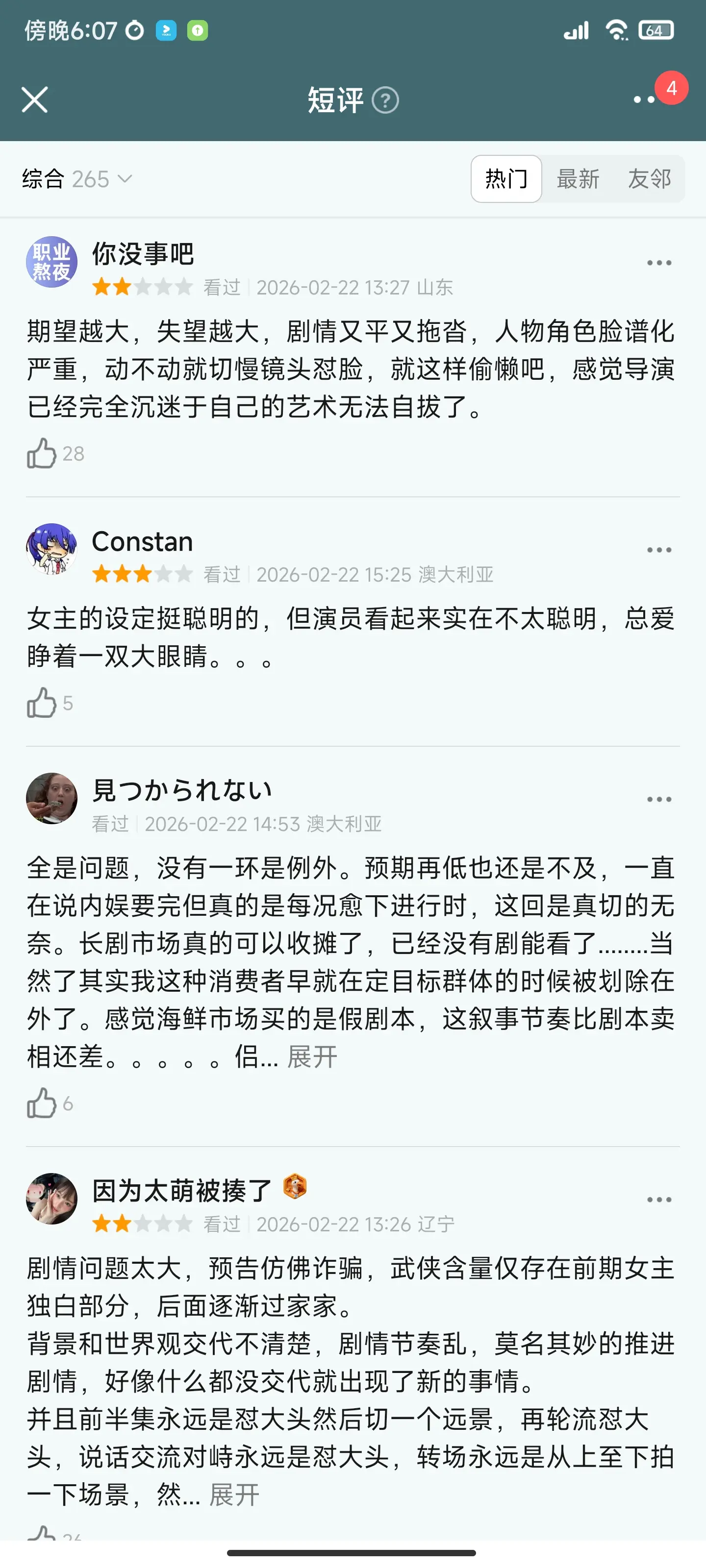 首播口碑也出来了,观众评价一针见血,就是无聊的剧情加上男女主机器人一样的演技简直是雪上加霜。武侠含量仅存在前期女主独白部分,背景和世界观交代不清楚,剧情节奏乱,直接生切镜头,一会儿男女主在这里,一会儿又在那里。感觉预告片就是诈骗,剧情一点张力没有,一直水时长,站桩对台词,没有有效剧情,小孩过家家一样,看得人昏昏欲睡。