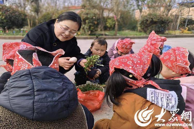 活动中,老师带领孩子们认识微山湖特产鸭蛋,通过看一看、摸一摸,感知鸭蛋圆圆的外形与硬硬的蛋壳,讲述“微山湖鸭子吃鱼虾,鸭蛋香又香”的家乡故事,唤醒孩子们对湖区物产的亲切记忆。随后,孩子们走进春日户外,寻找并采摘鲜嫩荠菜,在泥土与绿意中感受春天的气息。