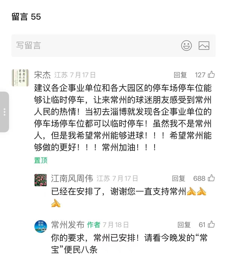 今年7月20日,常州队主场对阵徐州队。比赛前几天,我们通过“常州发布”发出倡议书《礼遇天下客!常州,全城响应》,号召全体市民拿出好客精神,欢迎八方来客。一位网友在评论区给出很诚恳的建议,让我们学习山东淄博开放企事业单位停车场的做法。正好我们想要更好地听取网友建议,很自然就回复了,“已经在安排了,谢谢您一直支持常州”。没想到,这条简单的回复引来这么多关注。