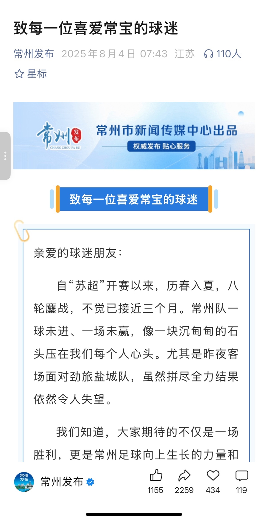 在最困难的时候,应该给常州市民和球员一些鼓励。比赛结束的第二天一早,我们便发布了《致每一位喜爱常宝的球迷》,感谢球员奋力拼搏、感谢球迷不离不弃、感谢市民包容宽容,同时承认球队在技术水平上存在不足,也表达了我们继续向前的决心。我们紧接着举行球迷座谈会,面对面听取球迷对常州足球发展的意见建议。