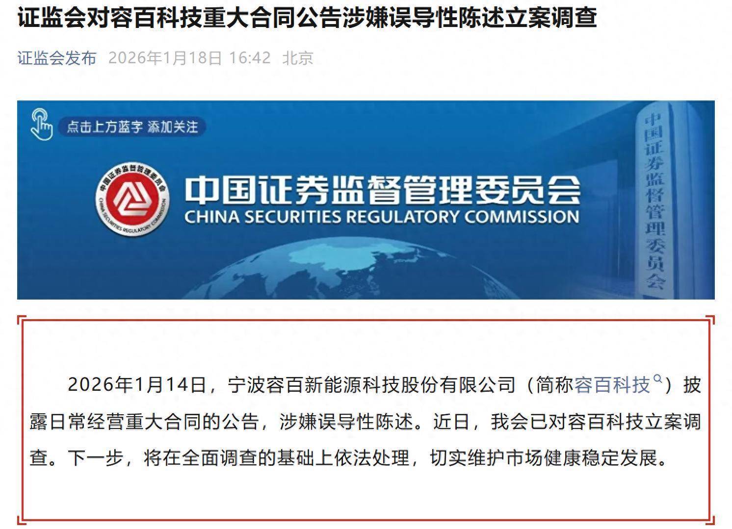 证监会1月18日发布公告,2026年1月14日,宁波容百新能源科技股份有限公司(简称容百科技)披露日常经营重大合同的公告,涉嫌误导性陈述。近日,证监会已对容百科技立案调查。下一步,将在全面调查的基础上依法处理,切实维护市场健康稳定发展。