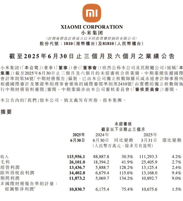但就在这样的混乱语境下,小米却递交了一份带有鲜明“逆周期”意味的财报:二季度营收1160亿元,同比增长30.5%,净利润108亿元,同比大增75%,双双创下历史新高。这已经是小米连续五个季度营收增速超过30%,连续三个季度净利润创纪录。